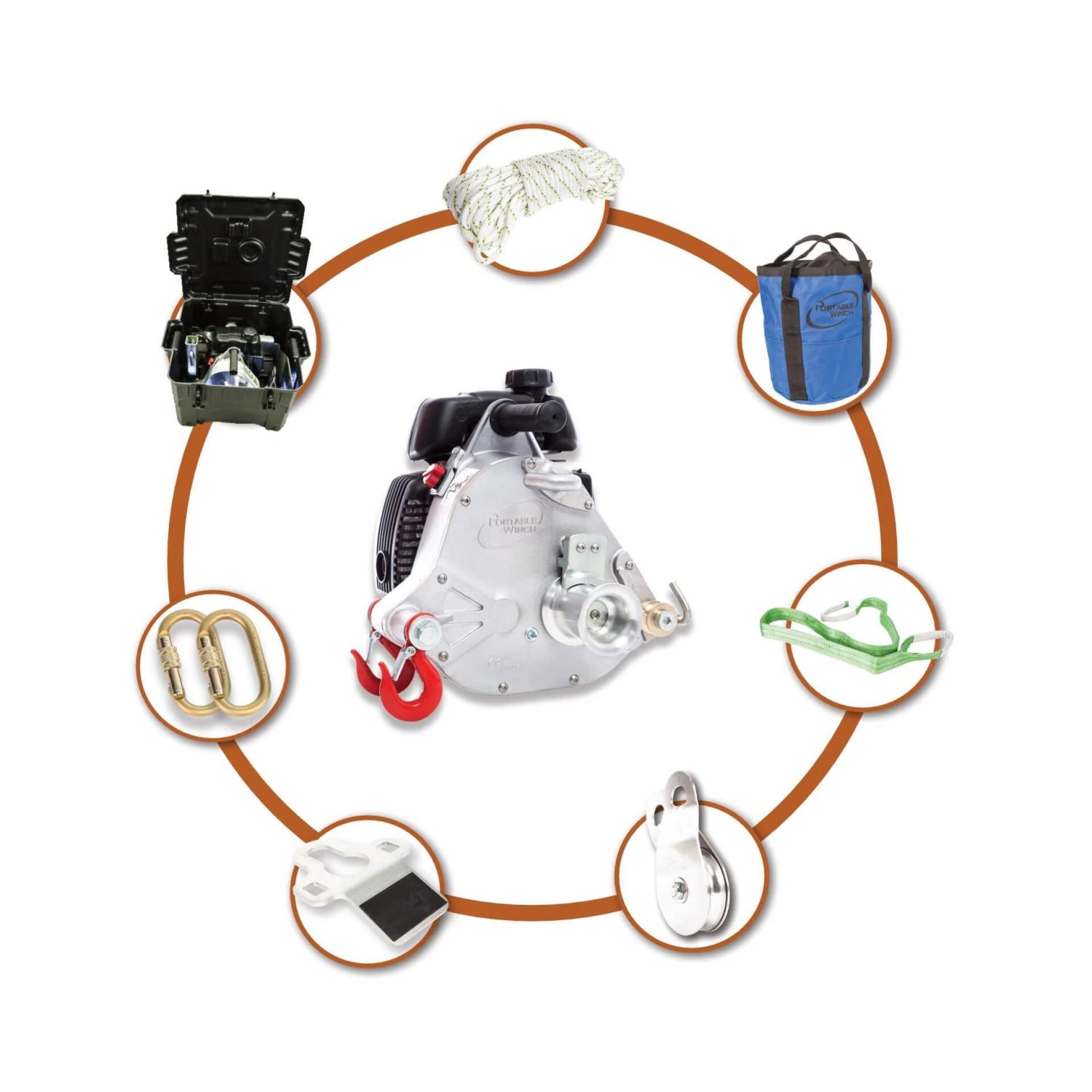 PCW-5000VK är ett kit med den portabla bensindrivna vinschen PCW-5000 och tillbehör för de som kör sitt fordon utanför vanliga vägar, eller off-road-entusiaster.